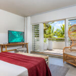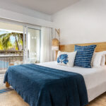 Las 182 habitaciones del hotel ofrecen un espacio de vida cómodo. La decoración refleja el entorno paradisíaco de la isla, con variaciones de blanco, índigo, turquesa y azul marino, evocando el cielo, la laguna y el océano. Muebles de madera y textiles con materiales naturales aportan un toque bohemio.